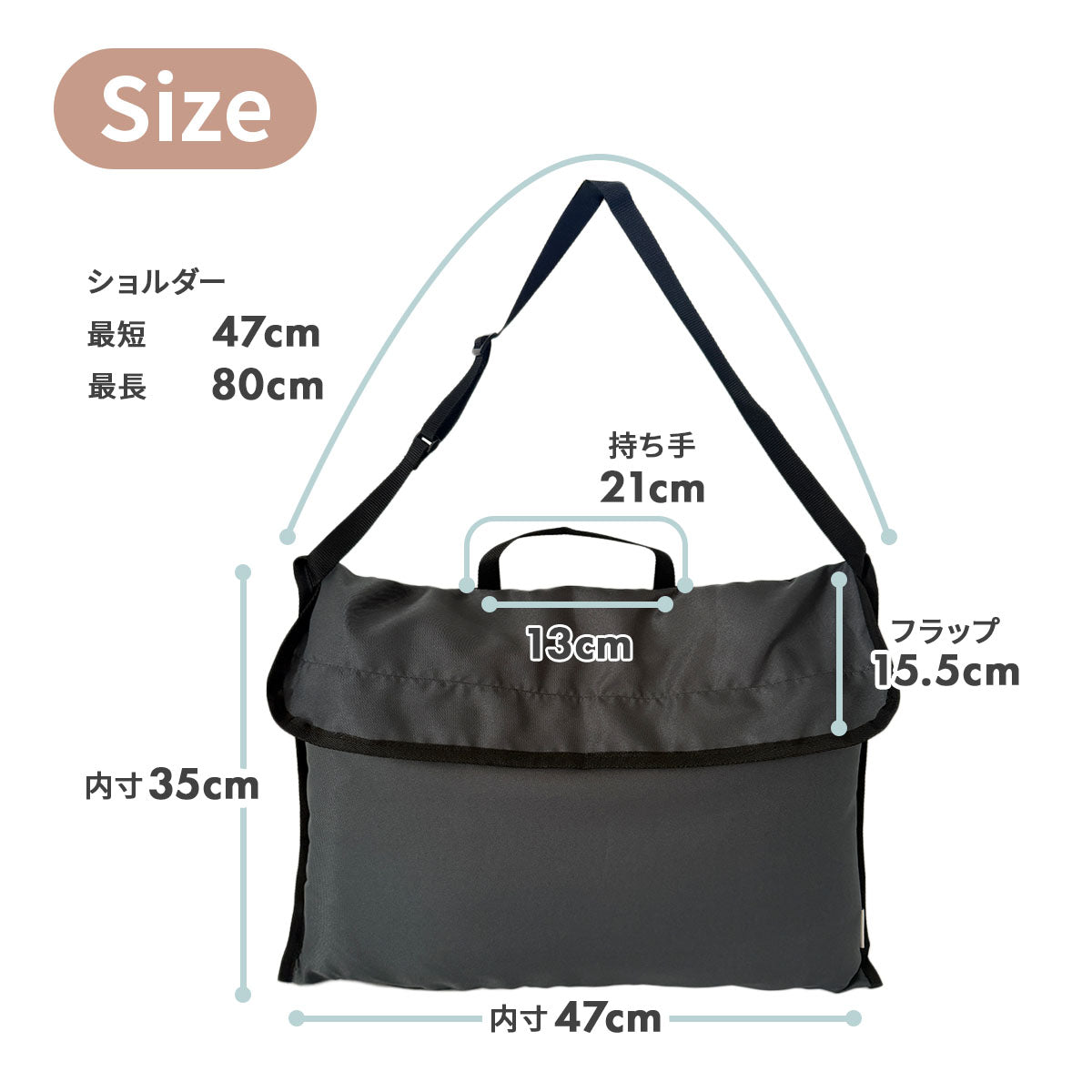 サイズ(約) | 内寸:縦35cm x 横47cm フラップ:15.5cm ショルダー:最短47cm、最長80cm 持ち手:付け位置13cm、長さ21cm |