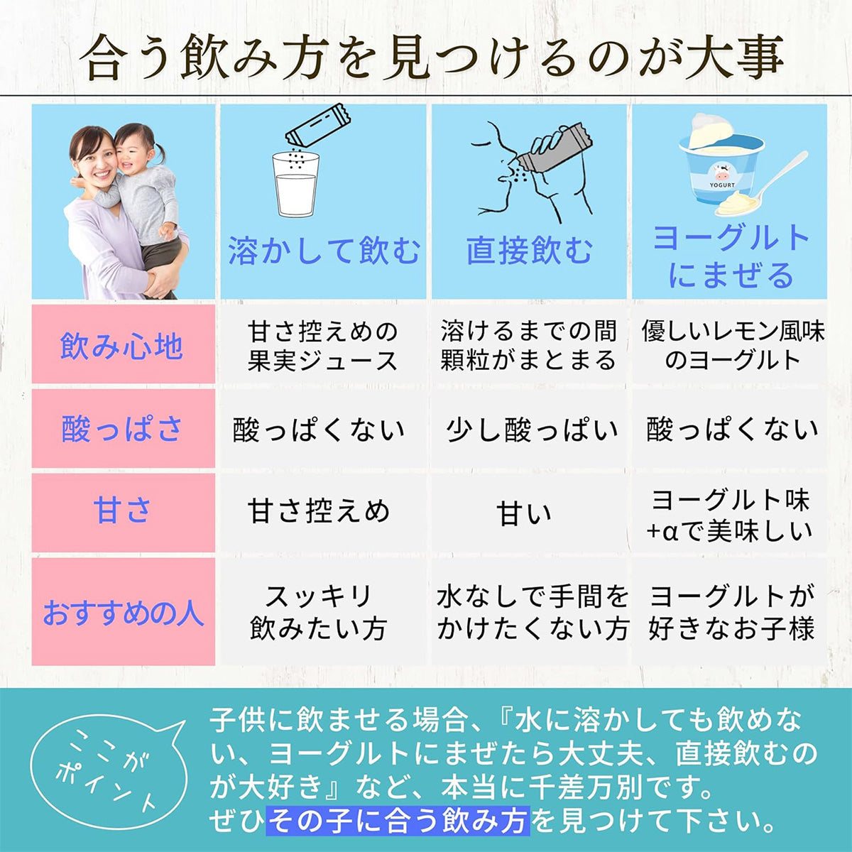 ・3種類の飲み方(水に溶かす、直接飲む、ヨーグルトに混ぜる)