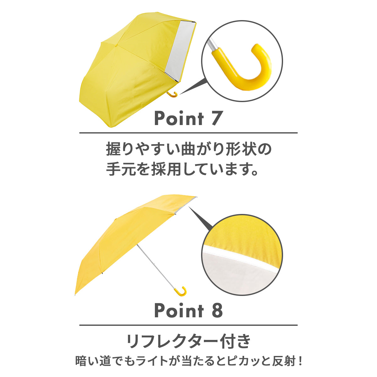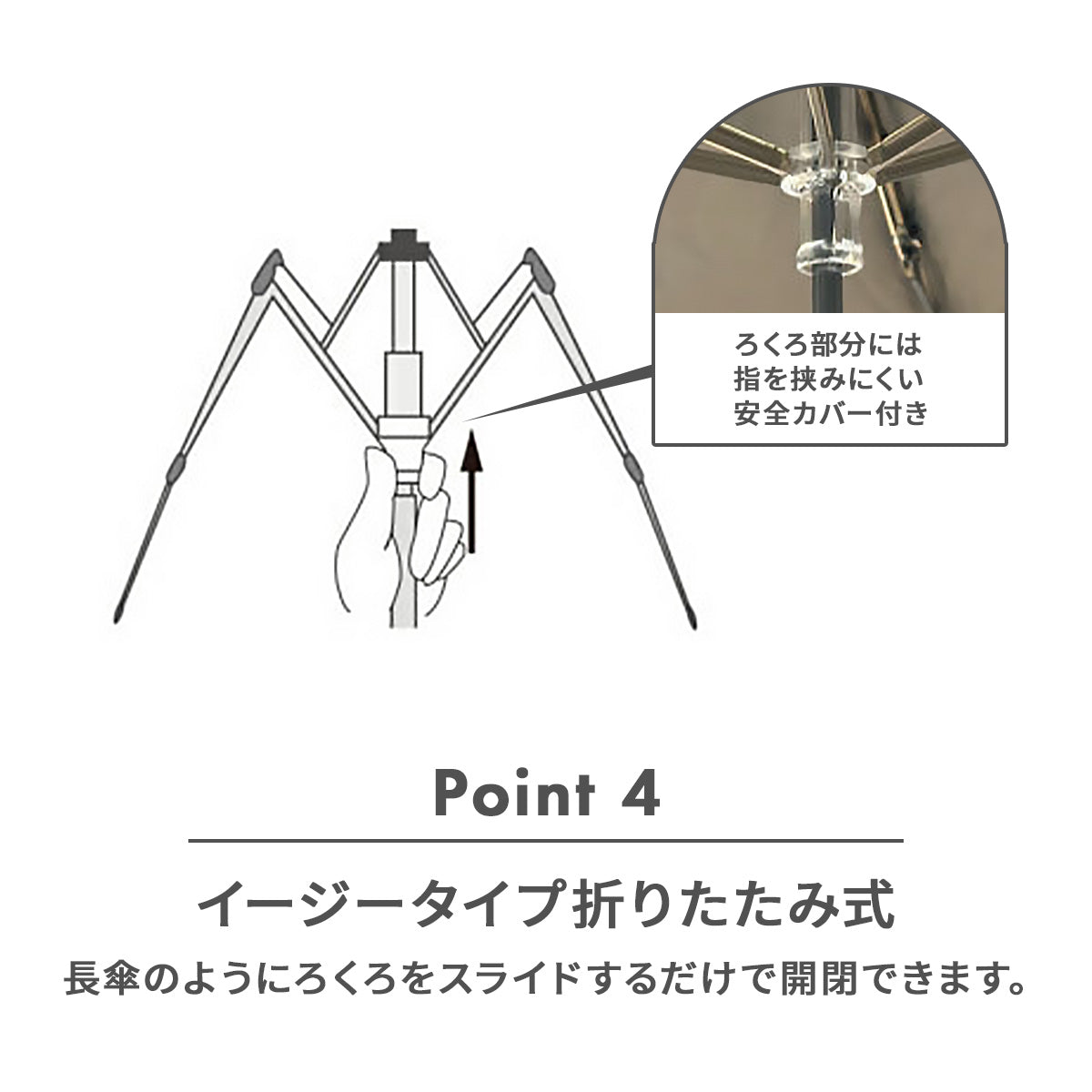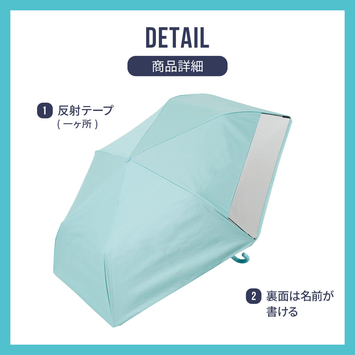 | 仕様 | 開閉:安全手開き 留め具:面ファスナー 反射テープ(一部分) 安全カバー付き UVカット率99.9%以上 遮光率99.9%以上 遮熱効果(遮熱指数35%以上) UPF50+ 撥水加工 |