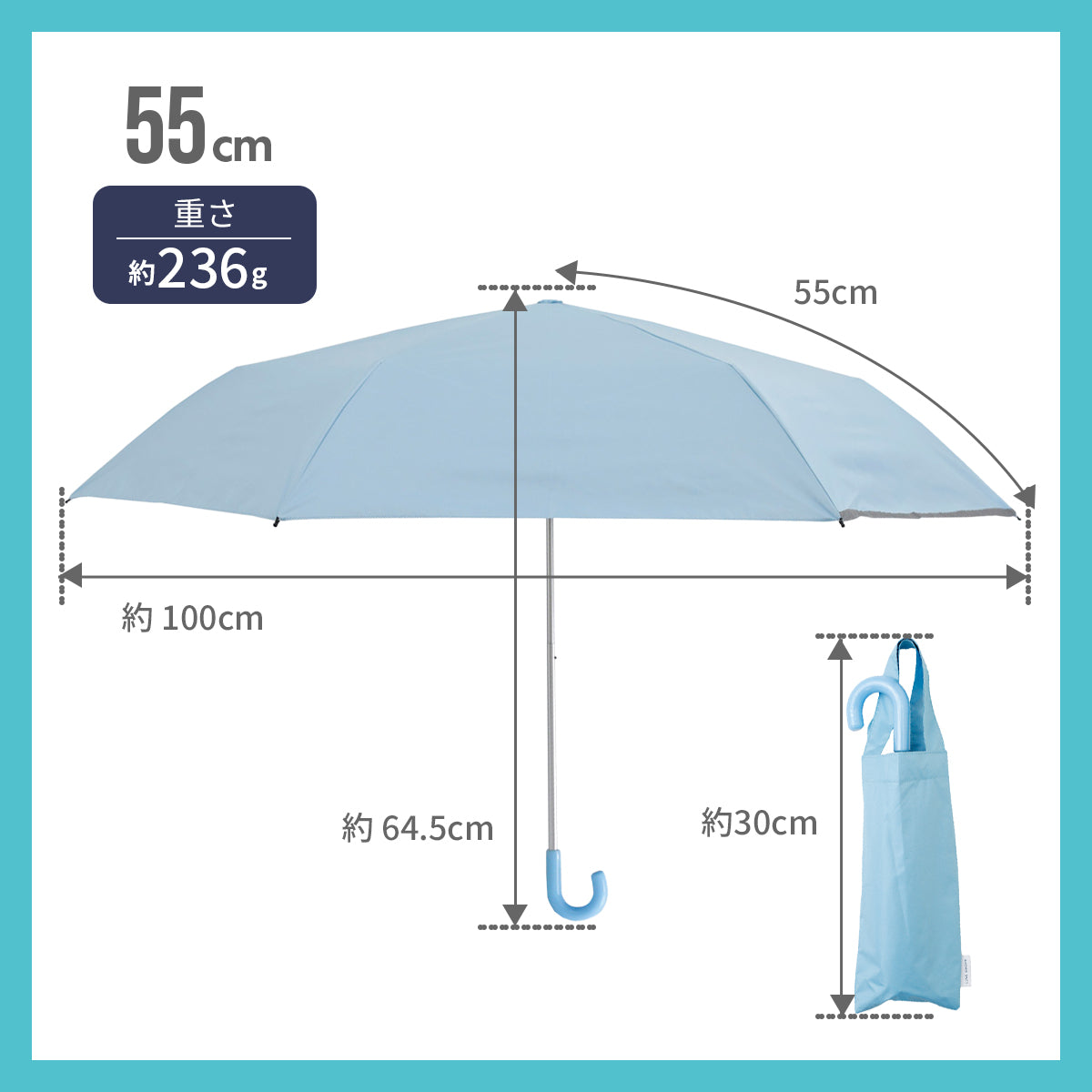 親骨の長さ:55cm 全長:64.5cm たたんだ時の長さ:30cm 直径:100cm 持ち手の長さ:7.5cm 持ち手の太さ:1.8cm |