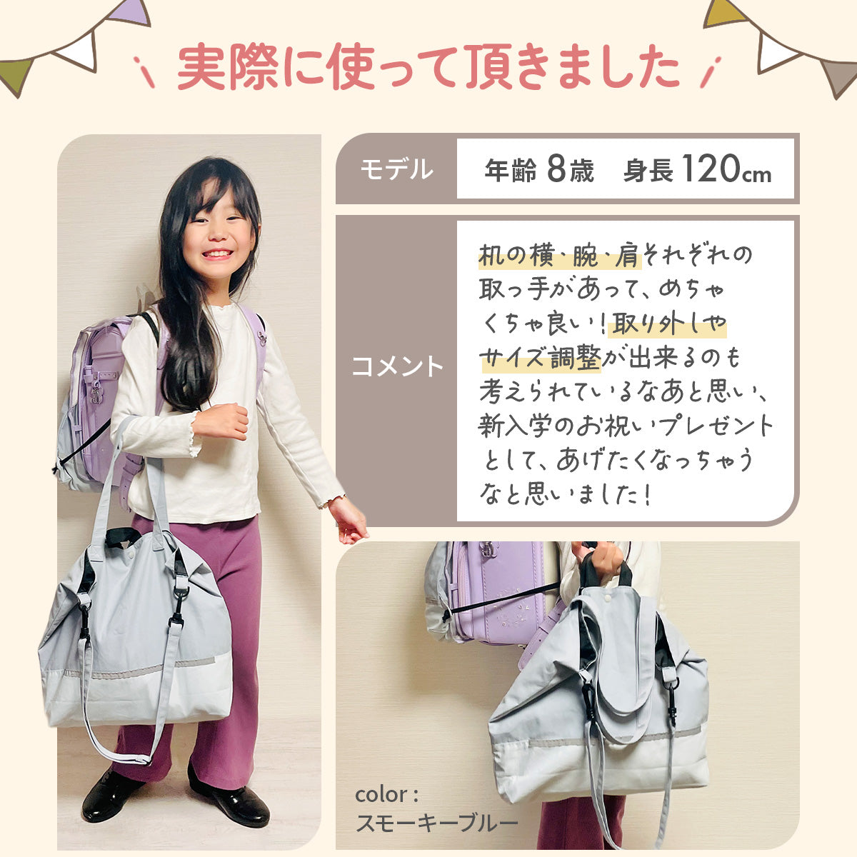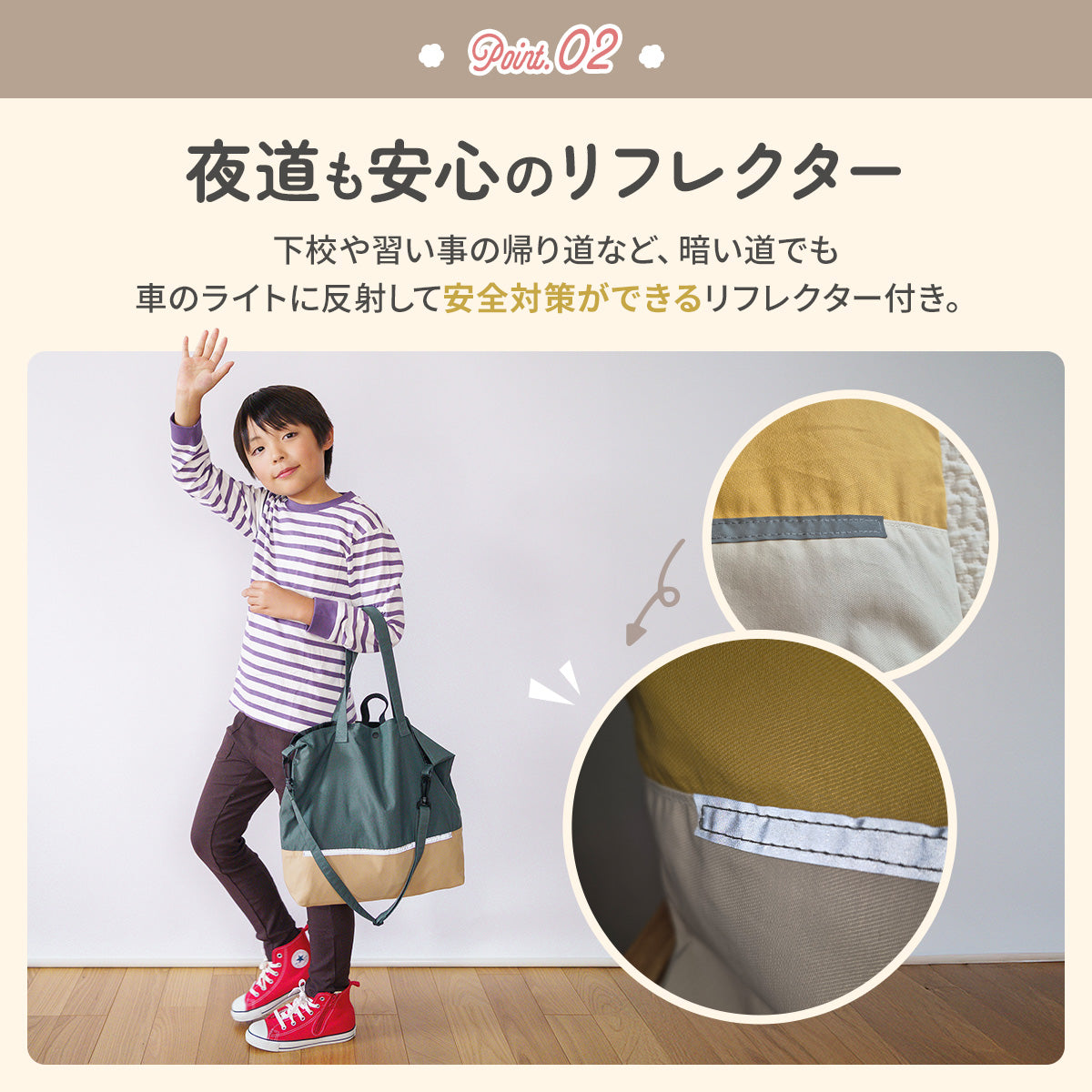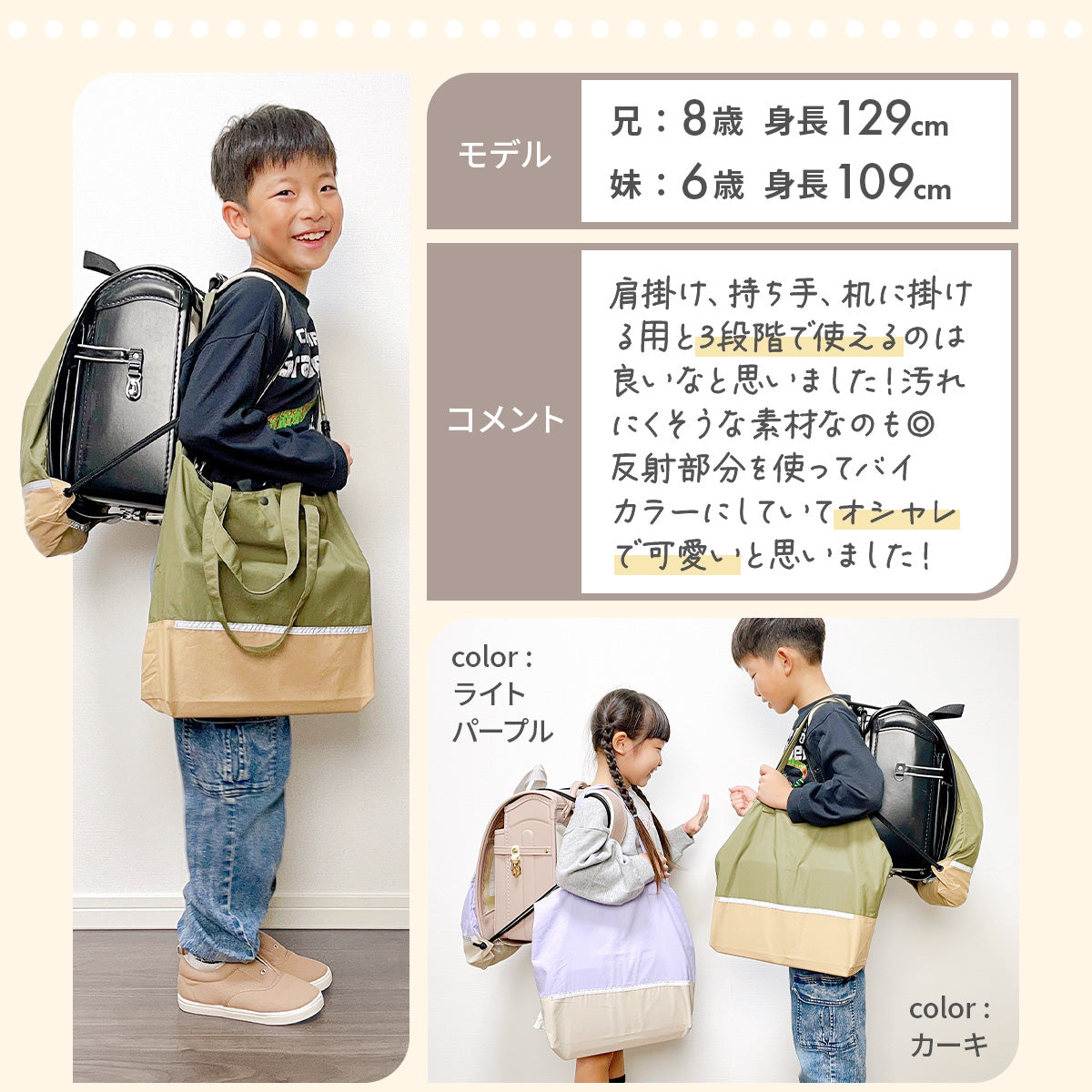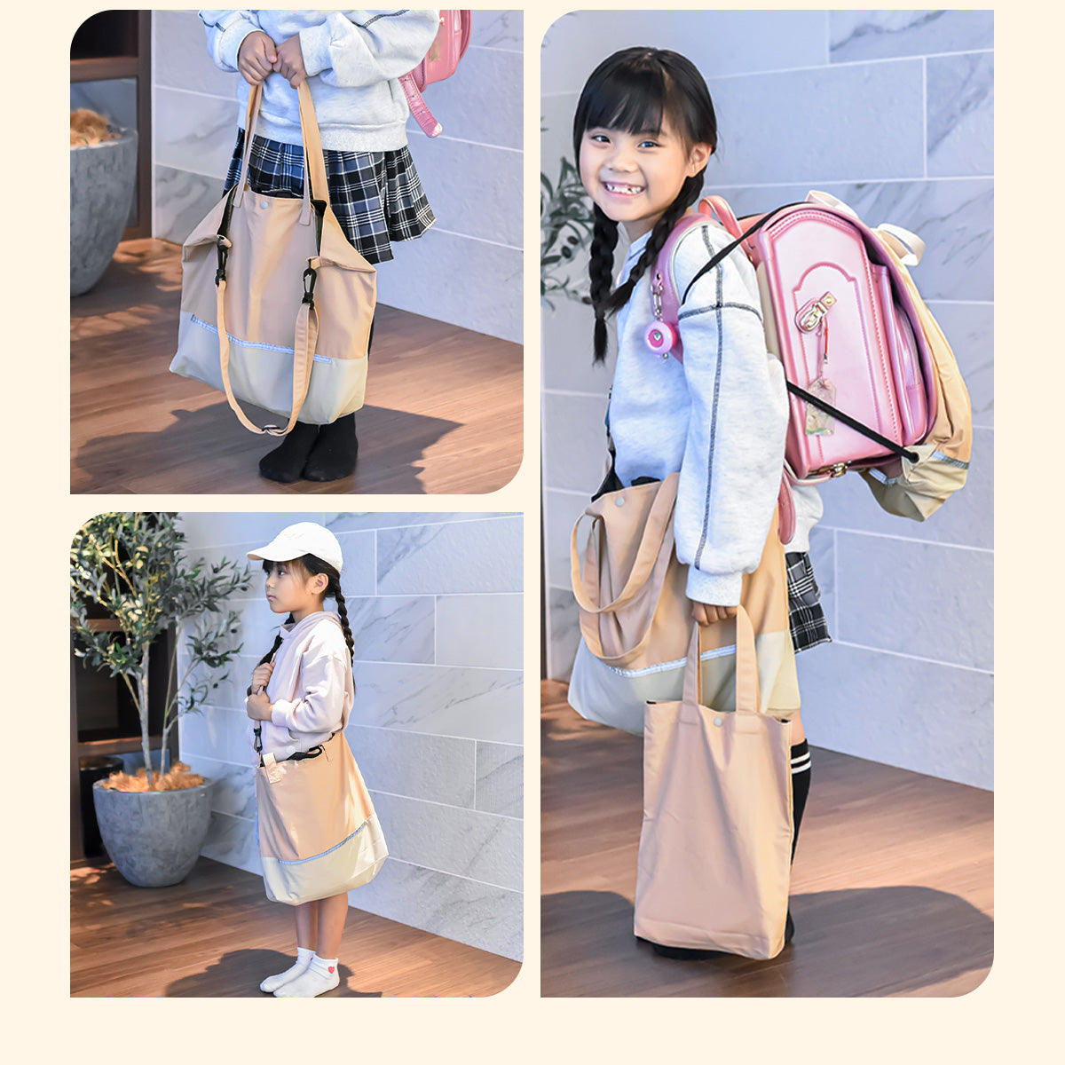 Haritiオリジナルのレッスンバッグは、入学を迎えるお子さまにぴったりのアイテムです。シンプルでおしゃれなデザインが魅力で、男の子も女の子も使いやすいです。ショルダー部分は取り外し可能で、リフレクター付きなので夜道も安心。学校の机に引っ掛けられるループや便利な内ポケット、底マチも備えています。持ち手は肩にかけやすい長さで使い勝手抜群です!