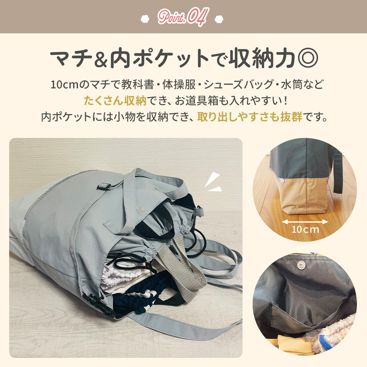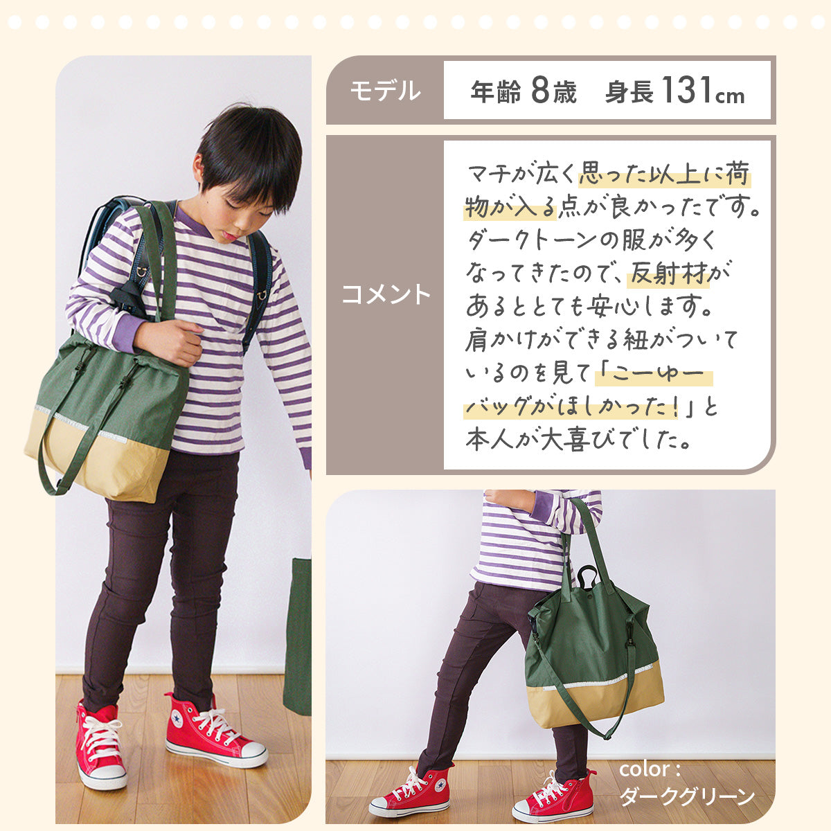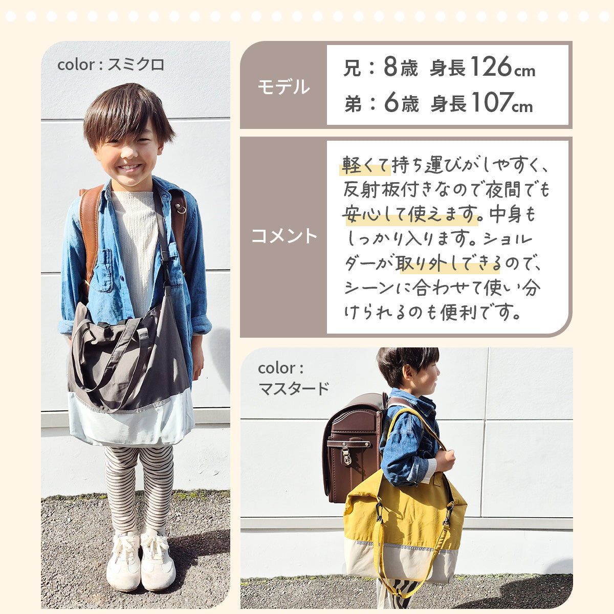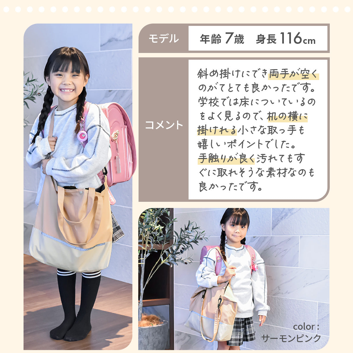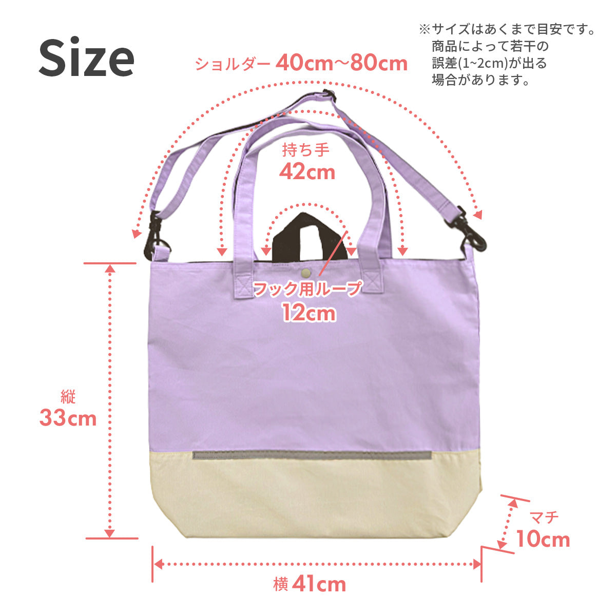 | サイズ | 縦33cm×横41cm×マチ10cm ショルダー長さ:最長80cm/最短40cm 持ち手:42cm フック用ループ:12cm |