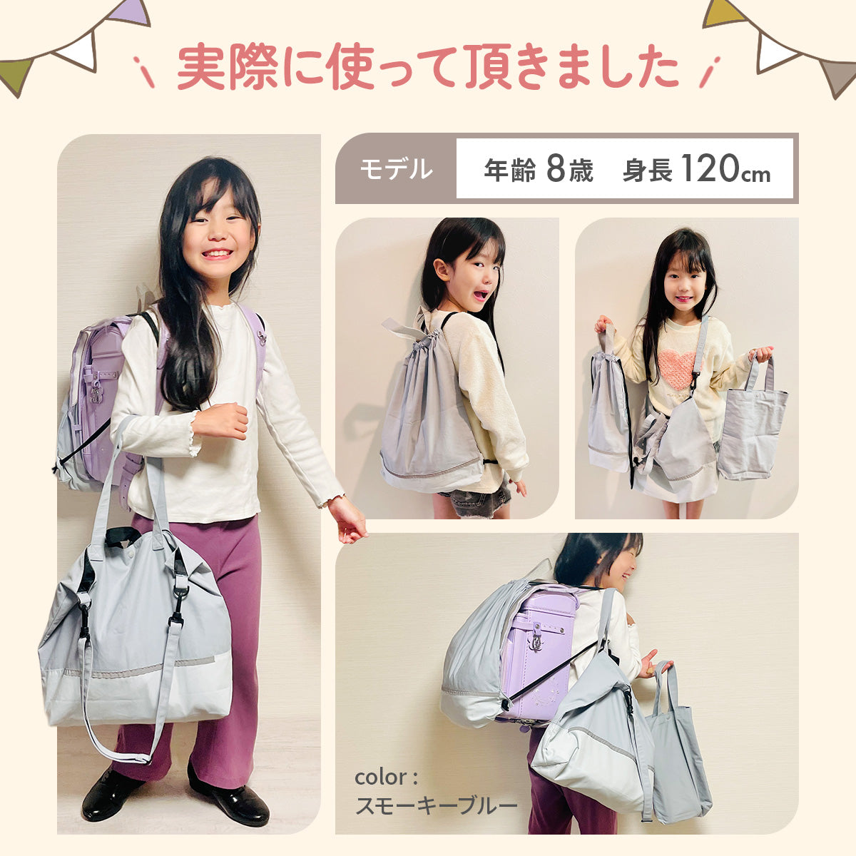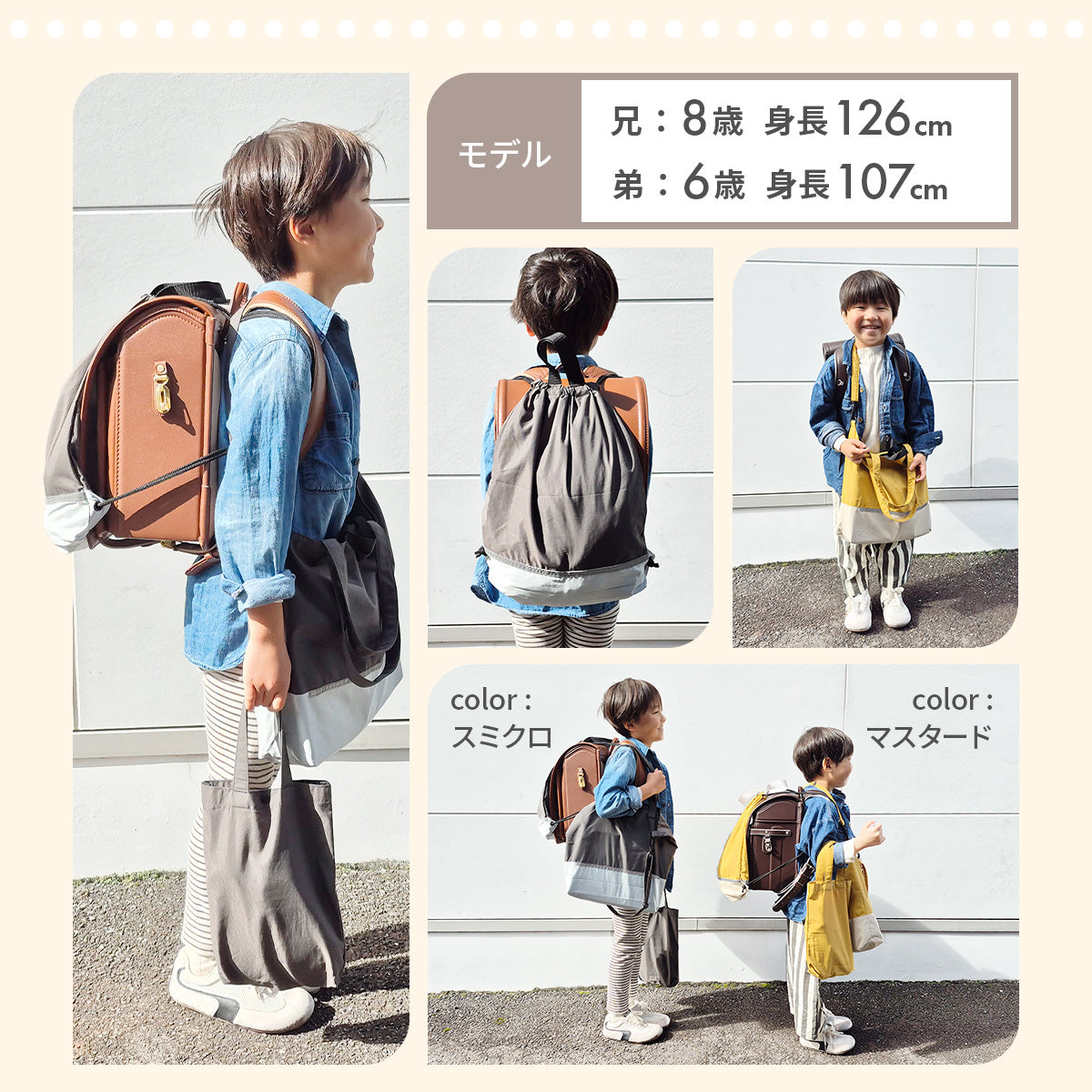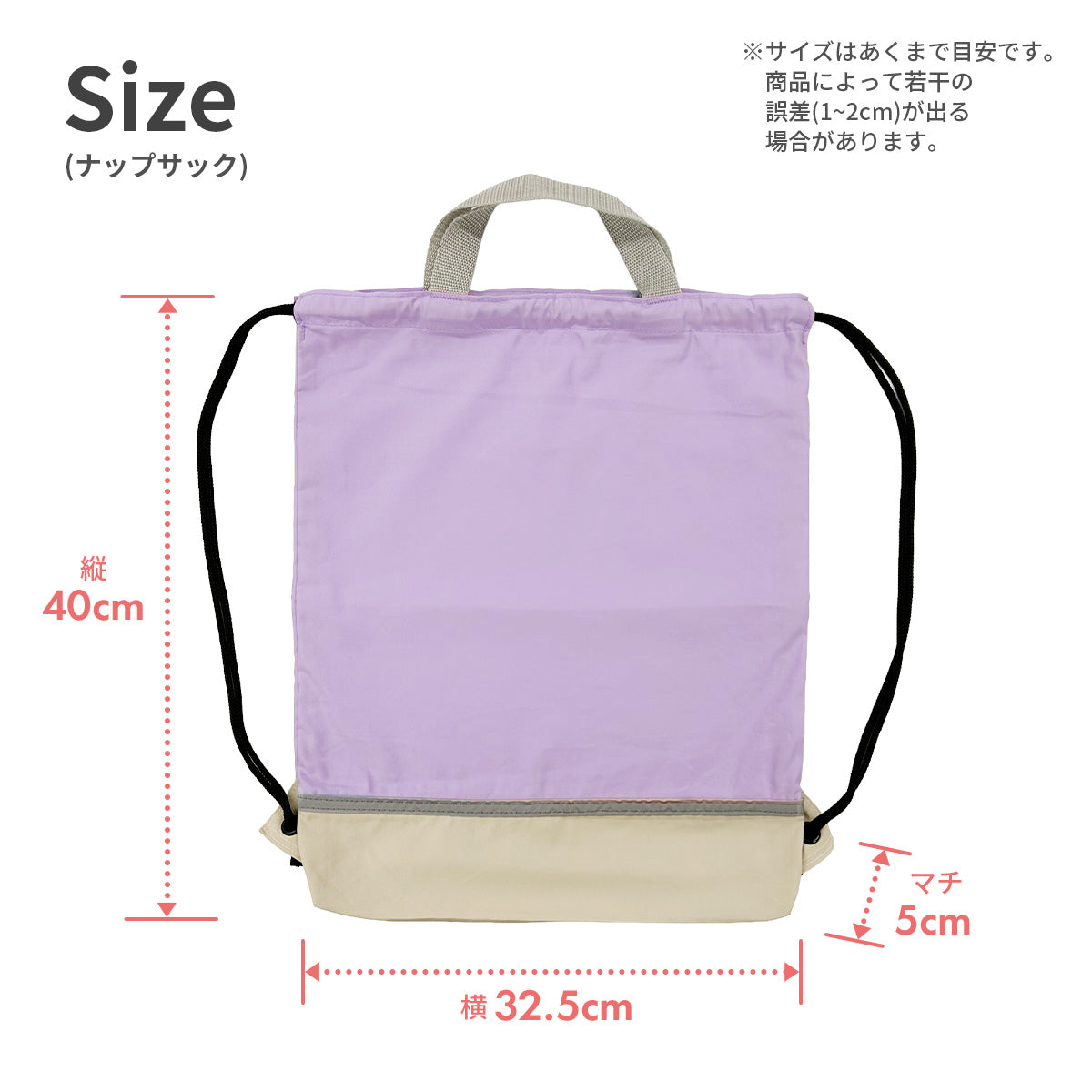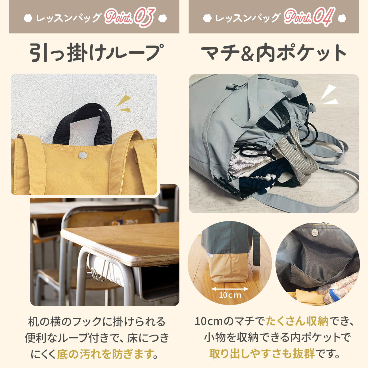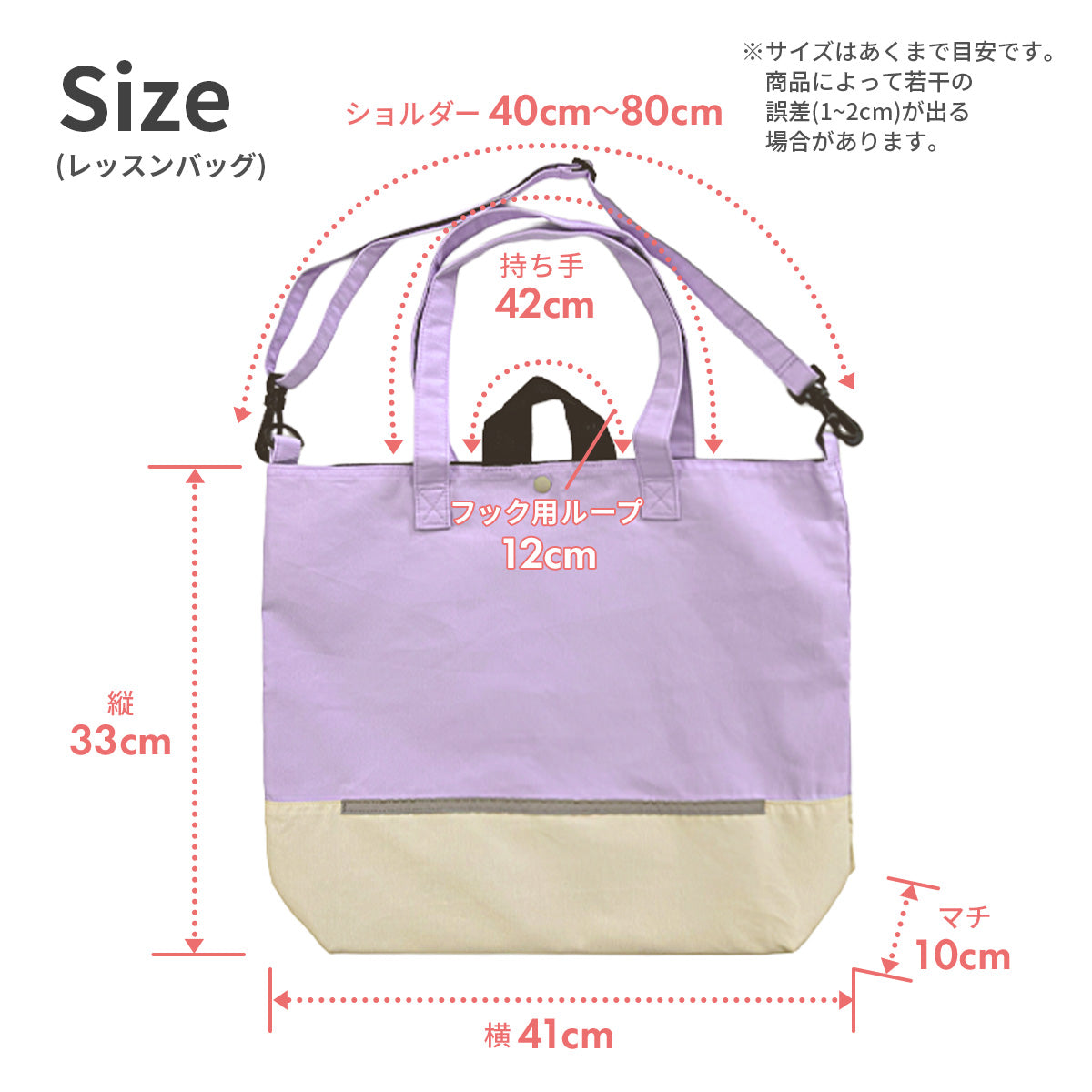 | サイズ | 【レッスンバッグ】 縦33cm×横41cm×マチ10cm ショルダー長さ:最長80cm/最短40cm 持ち手:42cm フック用ループ:12cm 【ナップサック】 縦40cm×横32.5cm×マチ5cm 【シューズバッグ】 縦30×横22×底マチ4cm 持ち手:29cm |